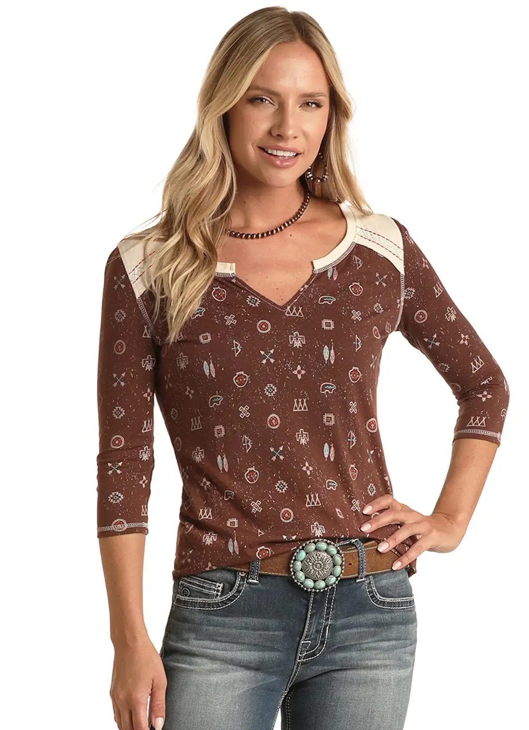 Brown with White Shoulders T-Shirt with Allover Southwestern Print.