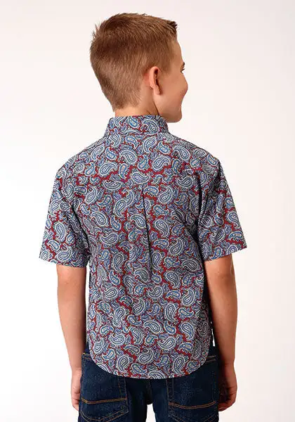 Blue and Red Paisley Short Sleeve Button Down Shirt.