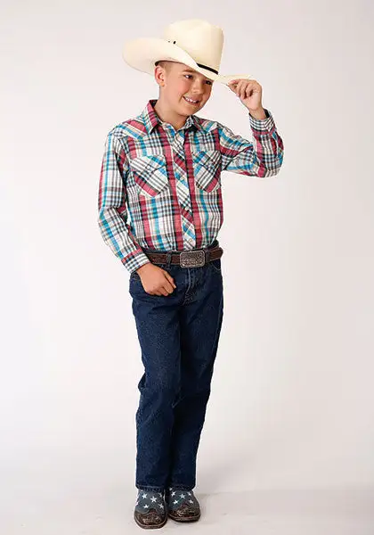 Cream, Turquoise, Red and Black Plaid Long Sleeve Snap Front Shirt.