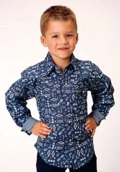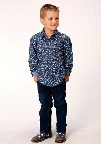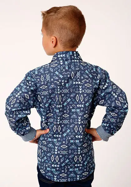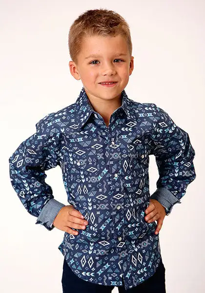 Blue All Over Aztec Print Long Sleeve Snap Front Shirt.