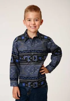 Blue and Black Eagle Aztec Print Long Sleeve Snap Front Shirt.