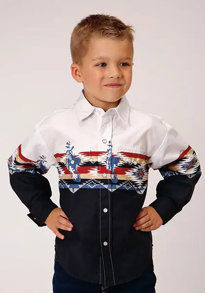 Black and White Aztec Rider Border Print Long Sleeve Snap Front Shirt.