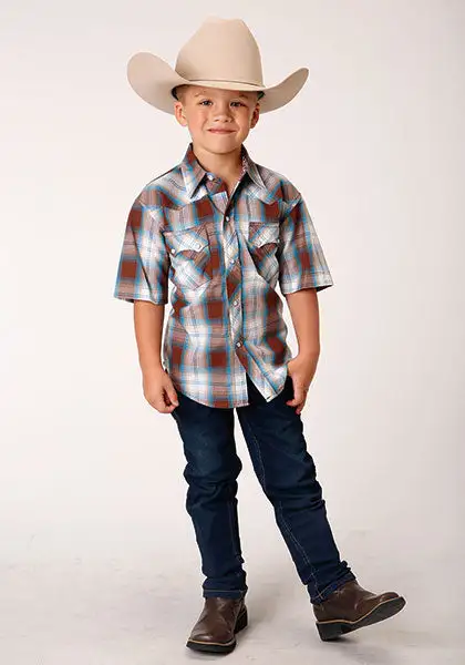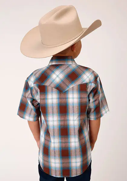Brown and Blue Plaid Short Sleeve Snap Front Shirt.