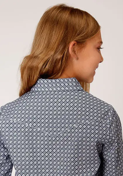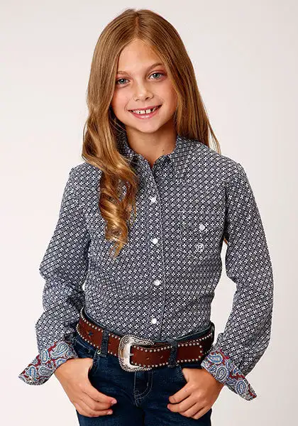 Blue and White Liberty Bell Foulard Print Long Sleeve Snap Front Shirt.