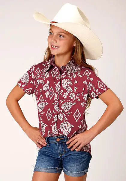 Red and White Tropical Print Short Sleeve Snap Front Shirt.