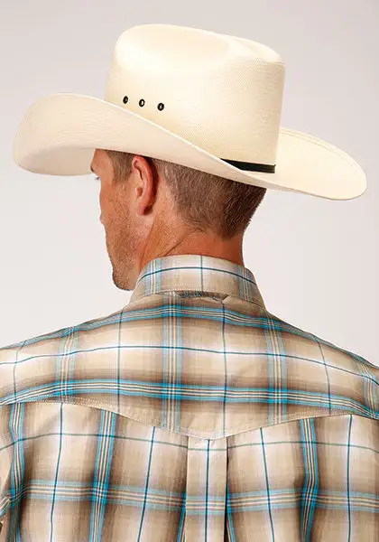 Tan and Khaki Plaid Short Sleeve Button Down Shirt.