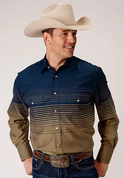 Navy and Khaki Border Stripe Long Sleeve Snap Front Shirt.