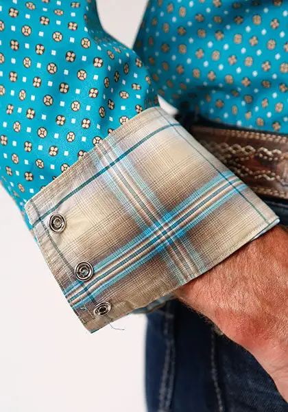 Turquoise Foulard Print Long Sleeve Snap Front Shirt.