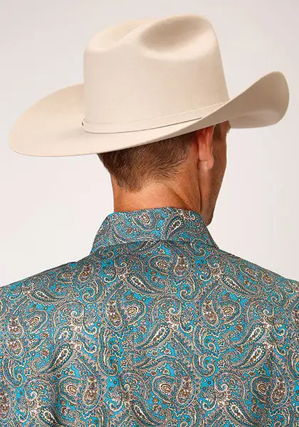 Turquoise and Tan Saddle Paisley Short Sleeve Snap Front Shirt.