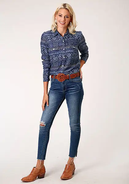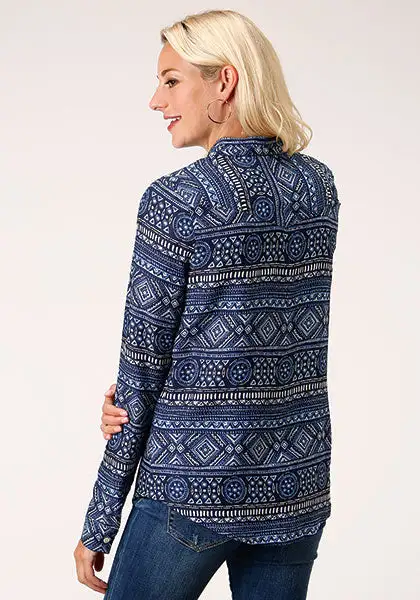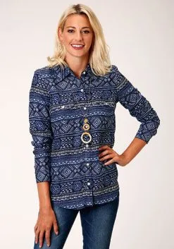Blue Tribal Print Long Sleeve Button Down Shirt.