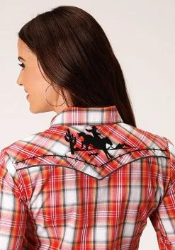Orange, Red, Blue and White Plaid Long Sleeve Snap Front Shirt with Bronc Rider Embroidery on Back Yoke.
