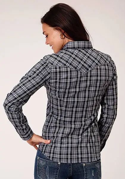 Grey, Black and White Plaid Long Sleeve Snap Front Shirt.