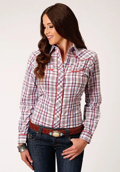 Cream, Red, Orange and Navy Plaid Long Sleeve Snap Front Shirt.