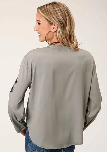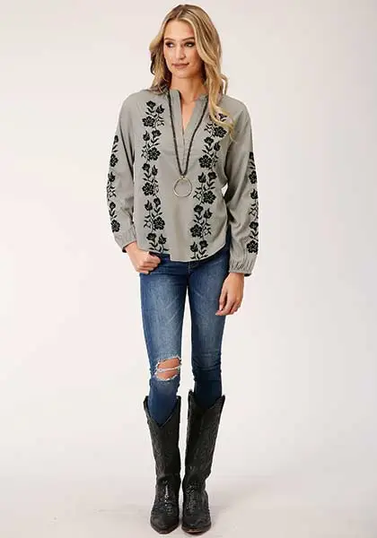 Grey Peasant Blouse with Embroidered Floral Pattern.