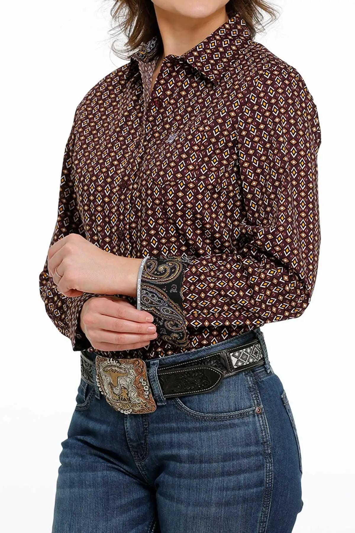 Purple and Gold Print Long Sleeve Button Down Shirt.