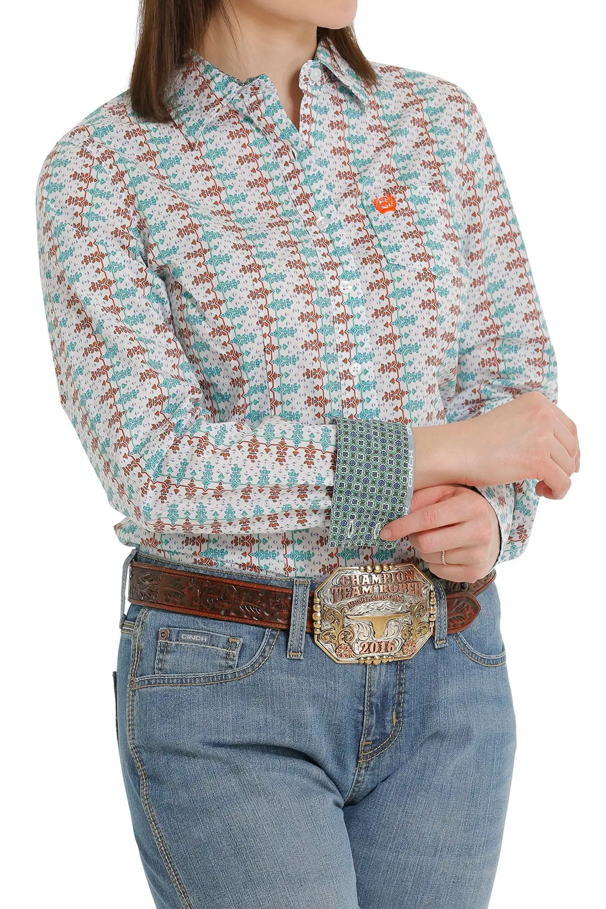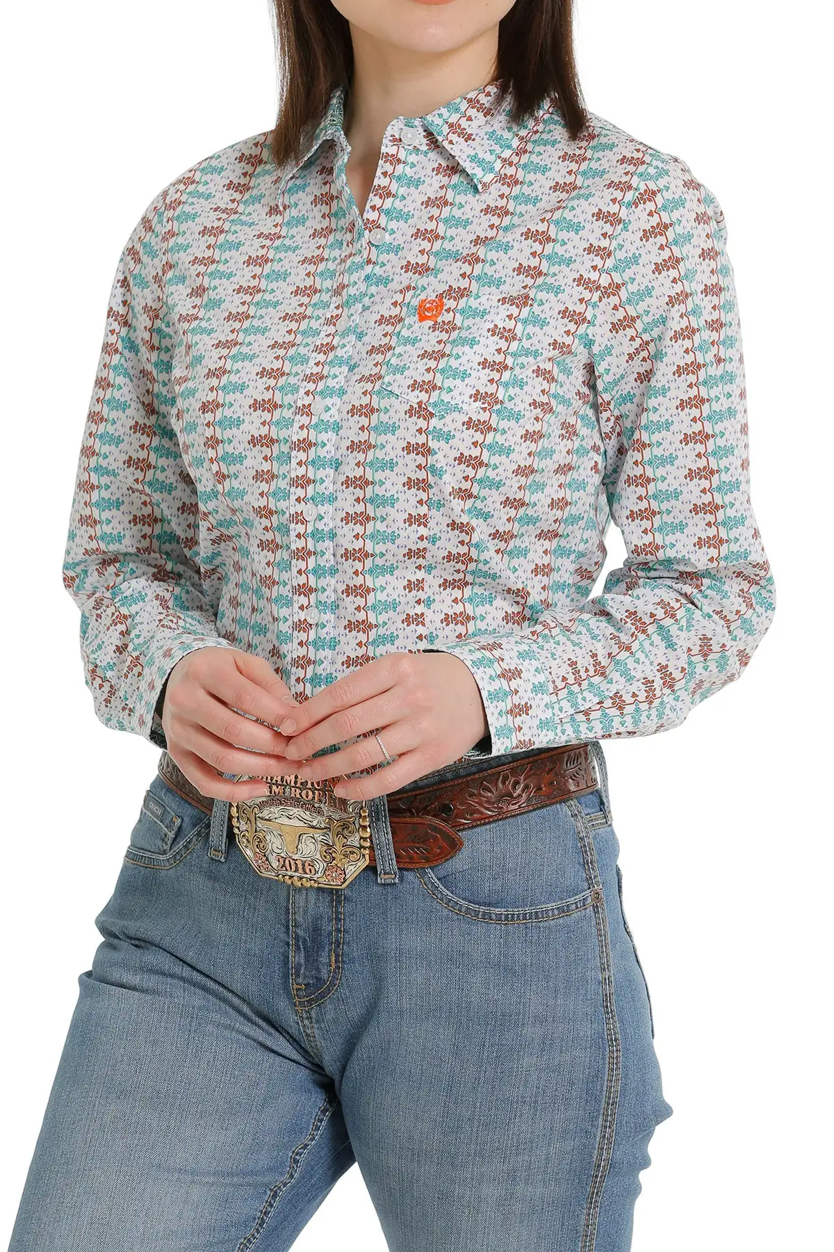 White, Blue Orange Print Long Sleeve Button Down Shirt.