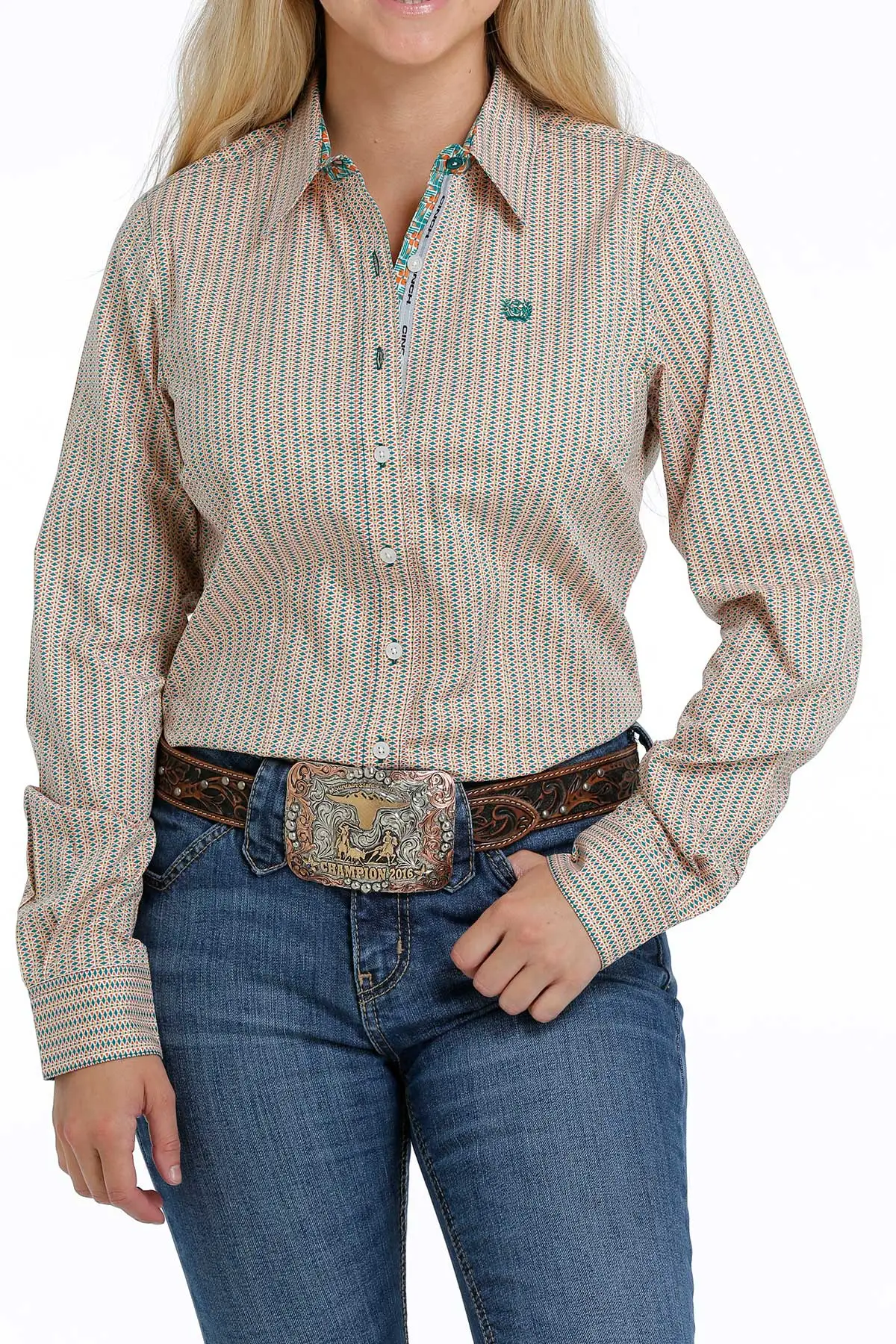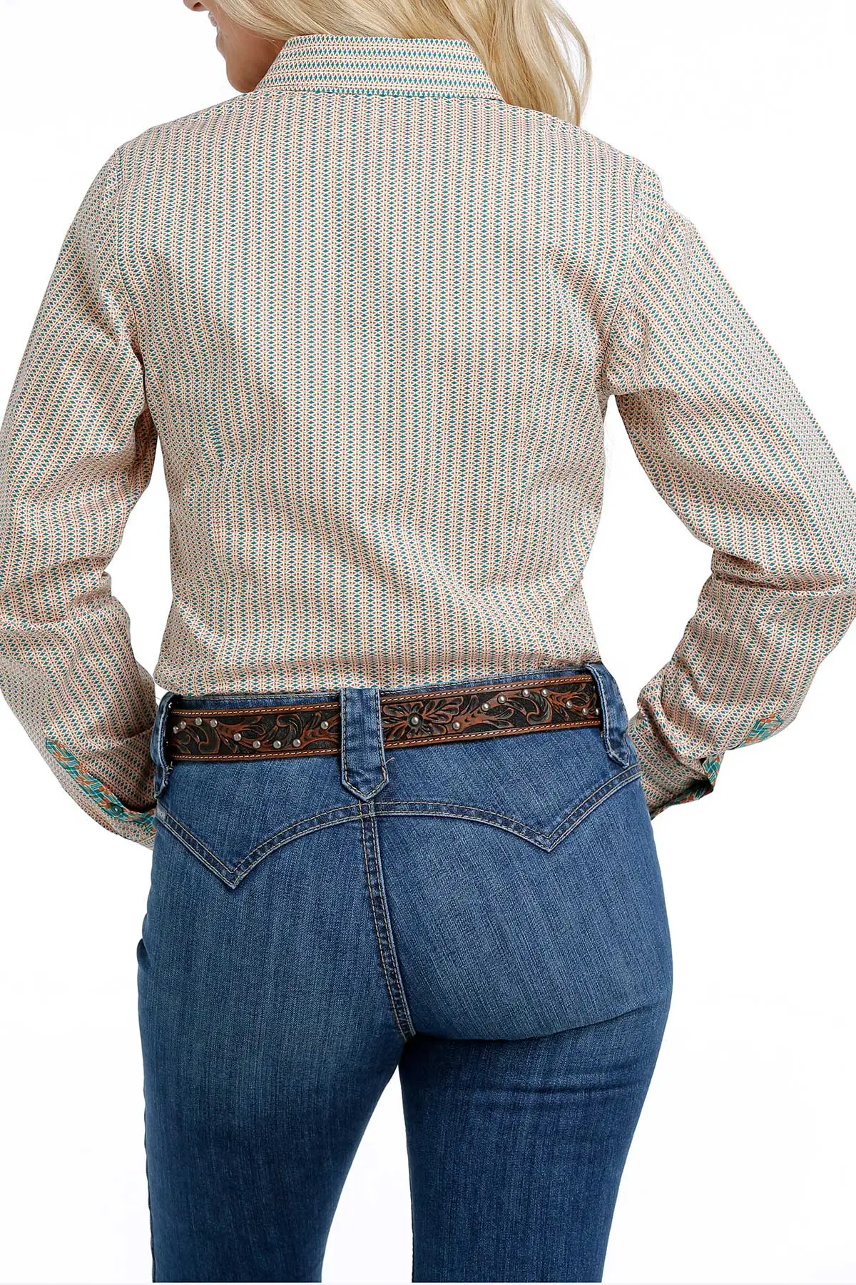 Tan and Turquoise Print Long Sleeve Button Down Shirt.