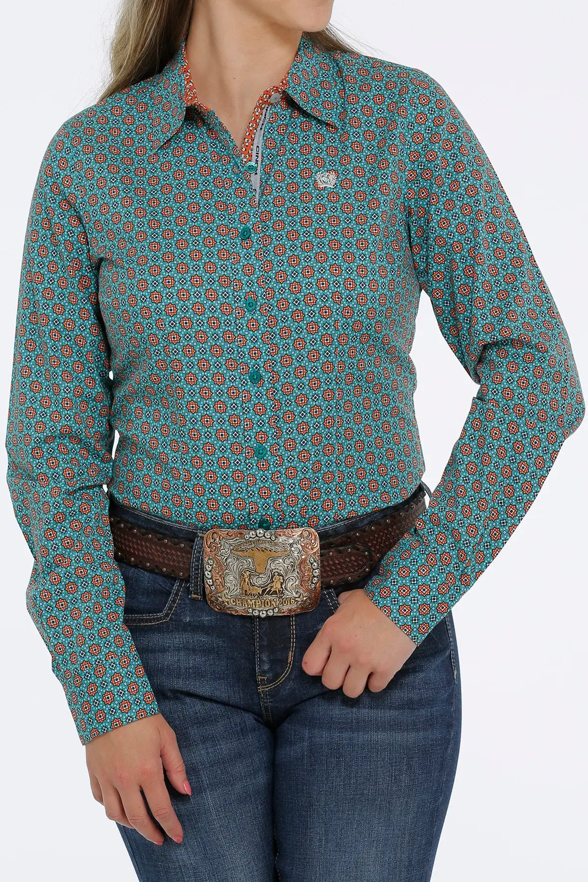 Cinch Women’s Turquoise & Orange Pattern Long Sleeve Button Down