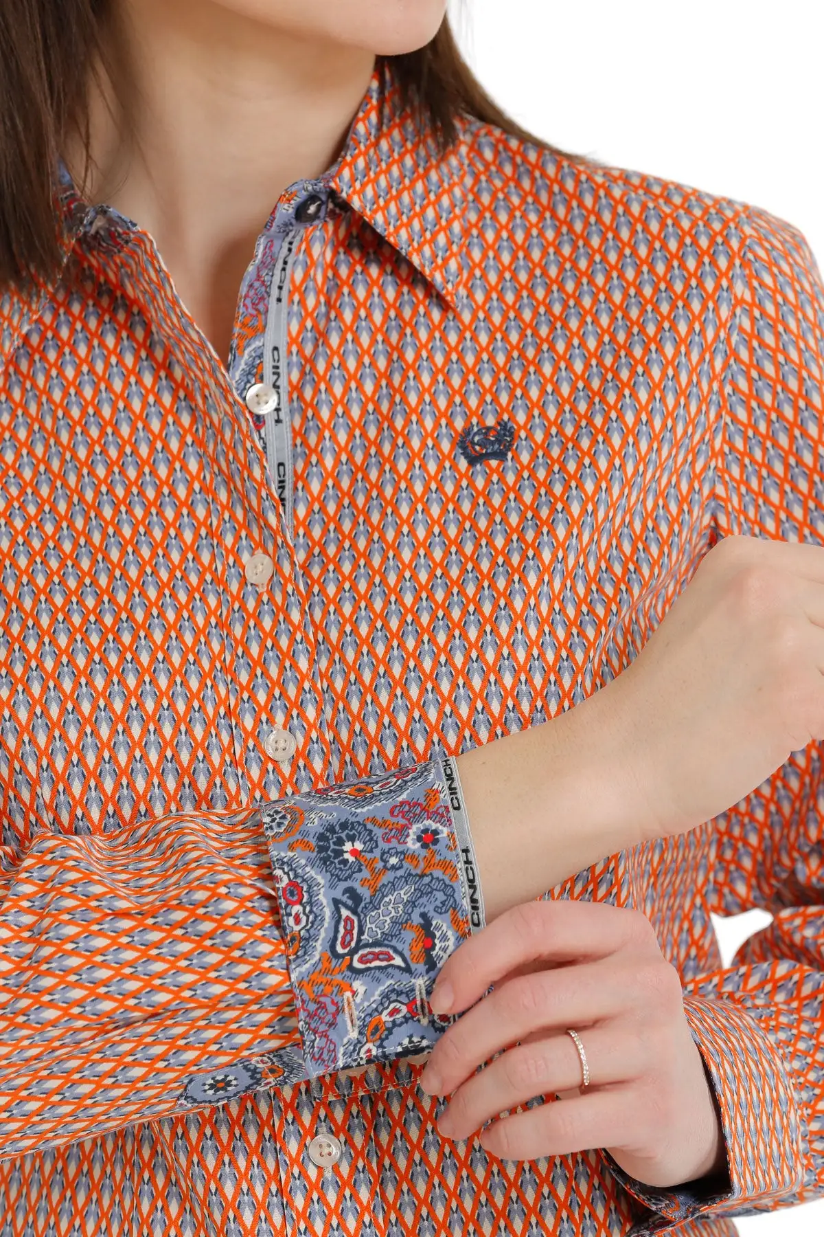 Cinch Women’s Orange, White & Blue Pattern Long Sleeve Button Down Shirt