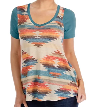 Multi Color Aztec Print Oasis T-Shirt with Teal Sleeves.