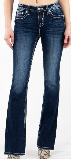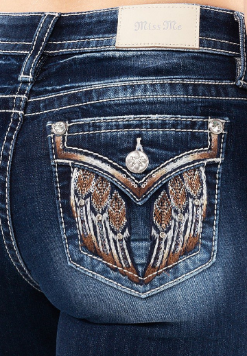 Dark Wash Bootcut Jean with Brown, Tan and White Wing Stitched Pocket.