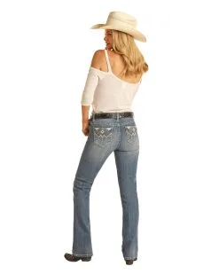 Medium Wash Bootcut Jean with Metallic Aztec Pockets.