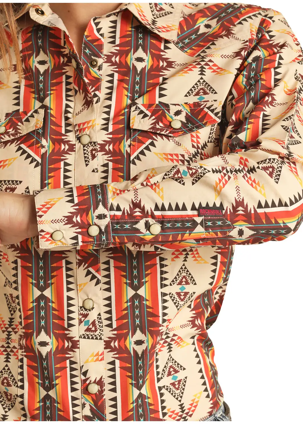 Orange and Cream Aztec Print Long Sleeve Snap Front Shirt.