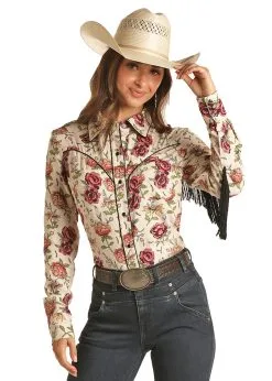 Natural and All Over Floral Print Long Sleeve Snap Front Shirt with Fringe Detail.