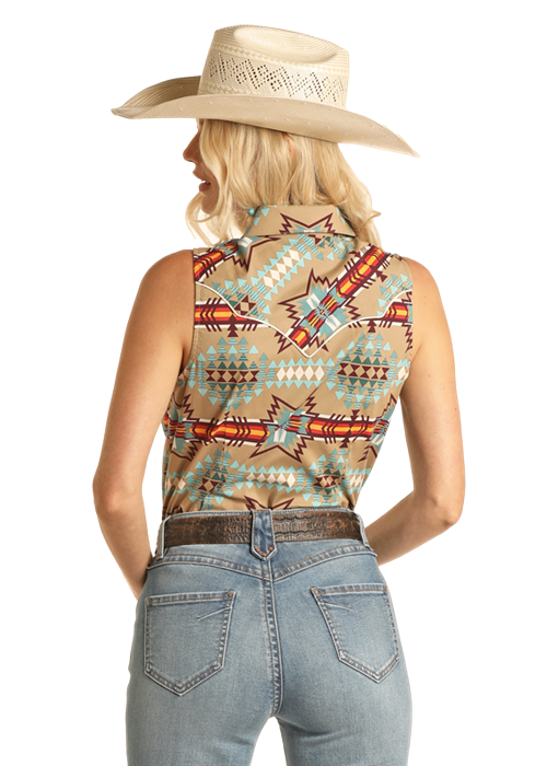 Brown with Multi-Color Bright Aztec Print Sleeveless Snap Front Shirt.