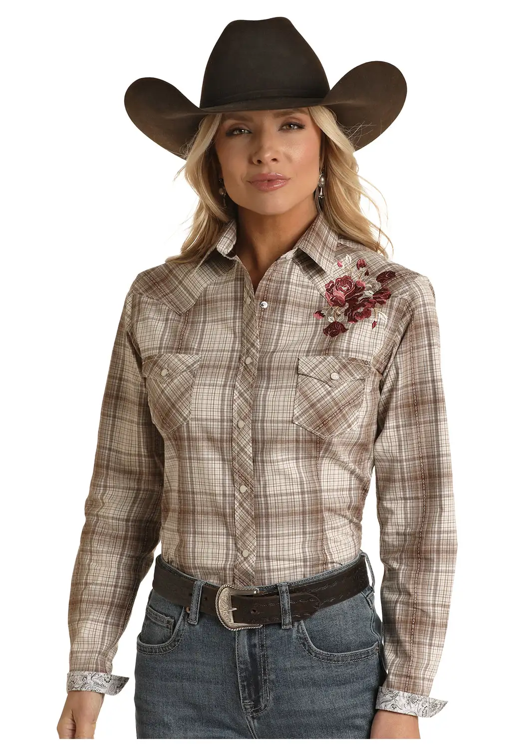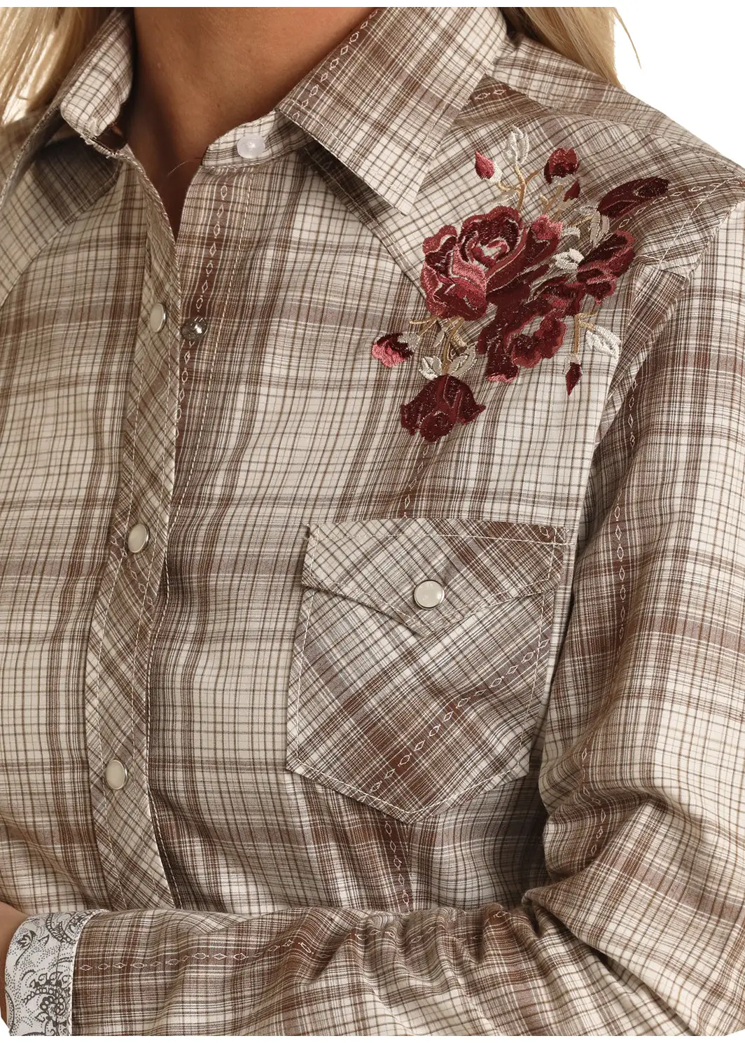 Brown and White Plaid Long Sleeve Snap Front Shirt with Floral Embroidery.