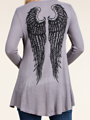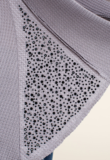 Grey Long Sleeve Blouse with Black Wing and Stone Detail.