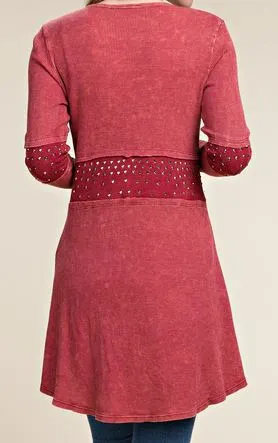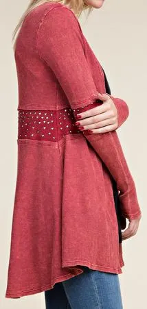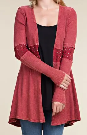 Red Special Dye Long Sleeve Cardigan with Stone Detail