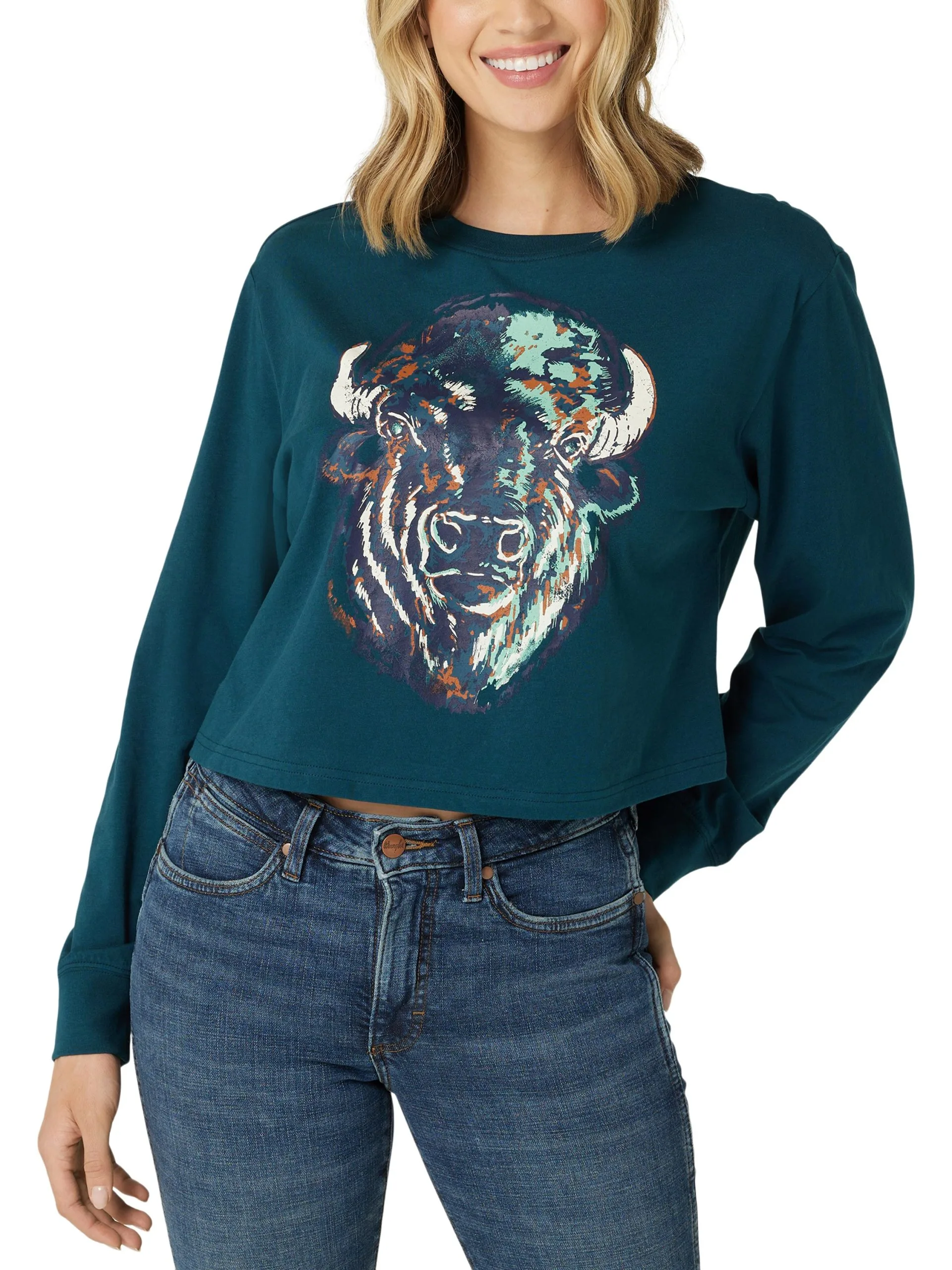 Dark Teal Long Sleeve Buffalo Graphic Cropped T-Shirt.