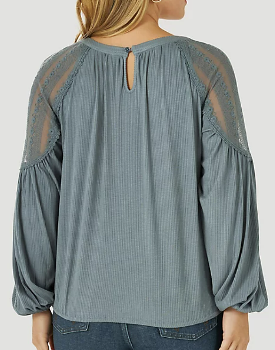Blue Long Sleeve Blouse with Lace Shoulder Detail.