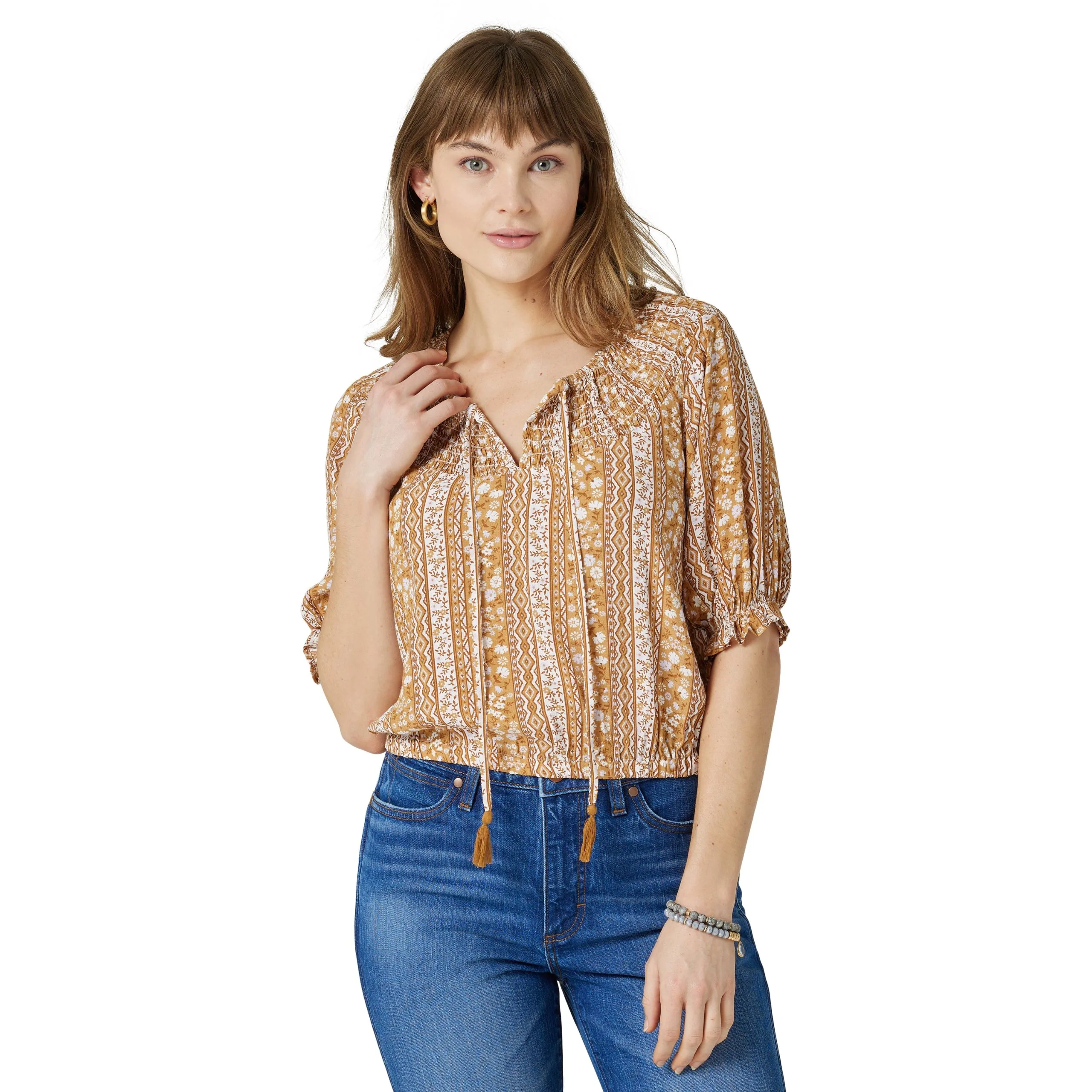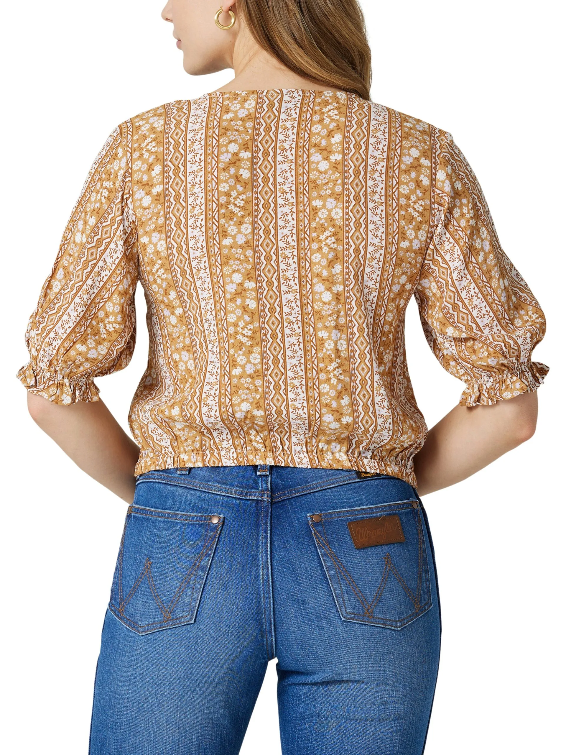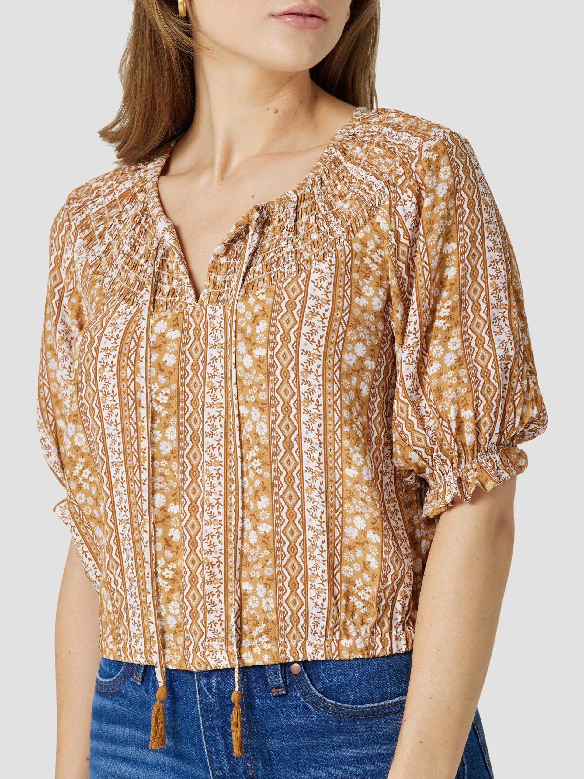 Brown and Yellow Floral Stripe Short Sleeve Smocked Blouse.