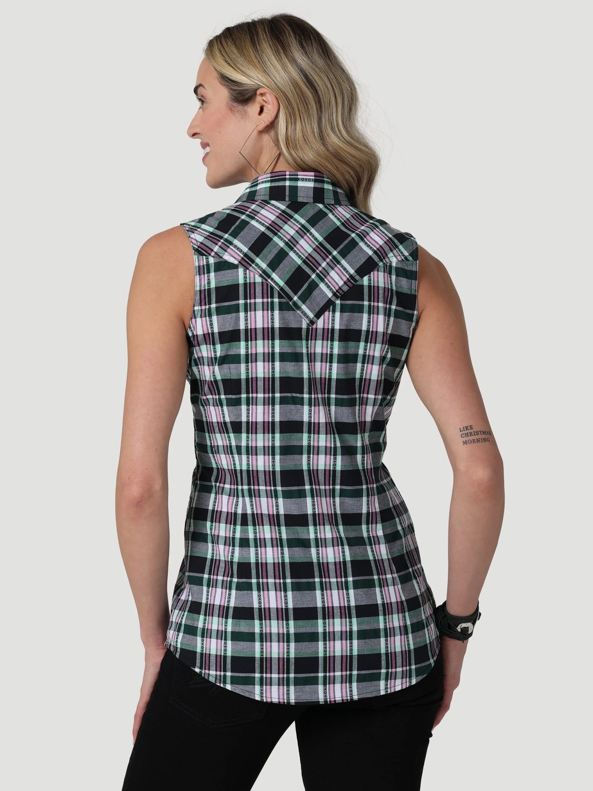 Deep Green Plaid Sleeveless Snap Front Shirt.
